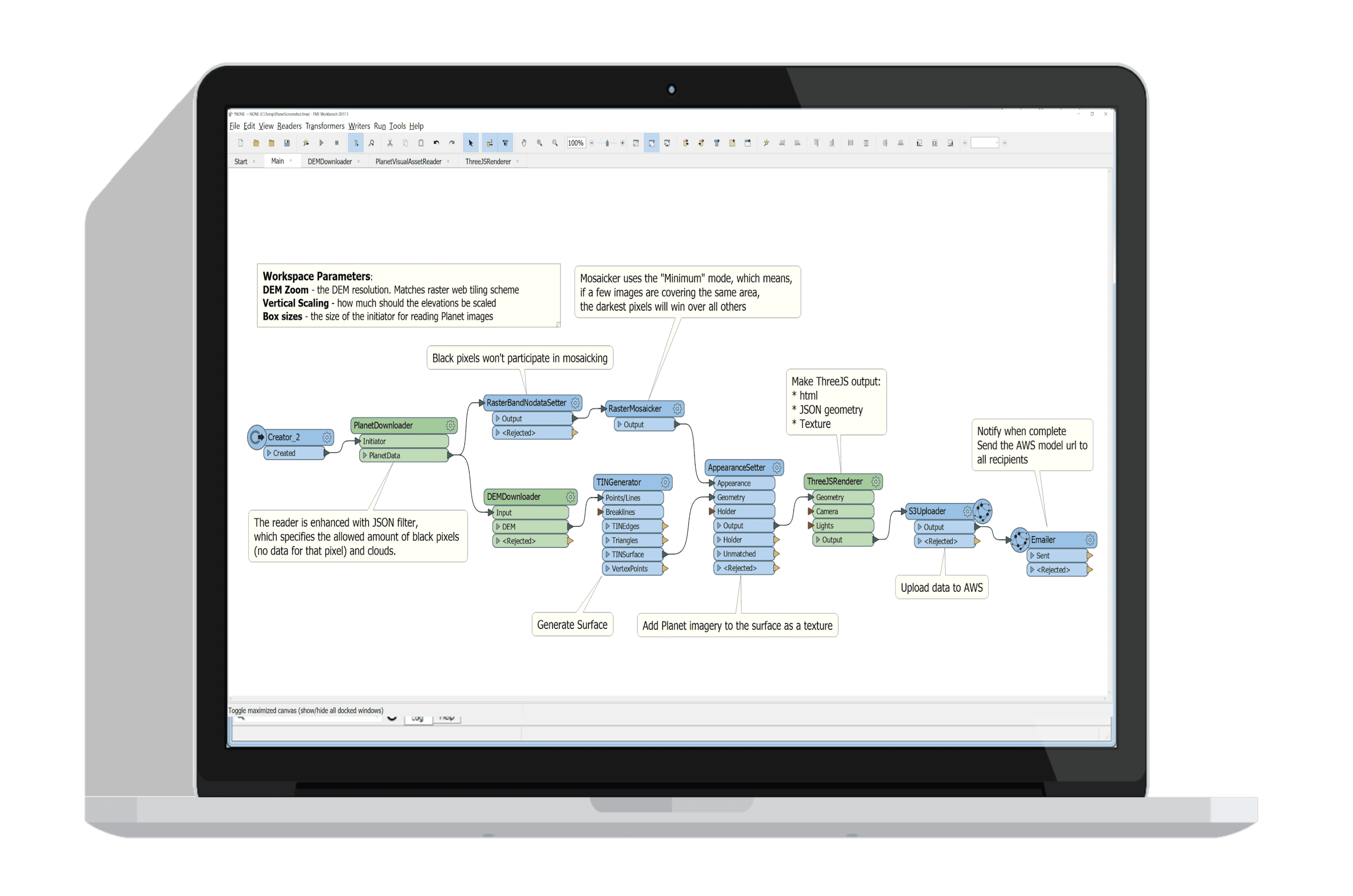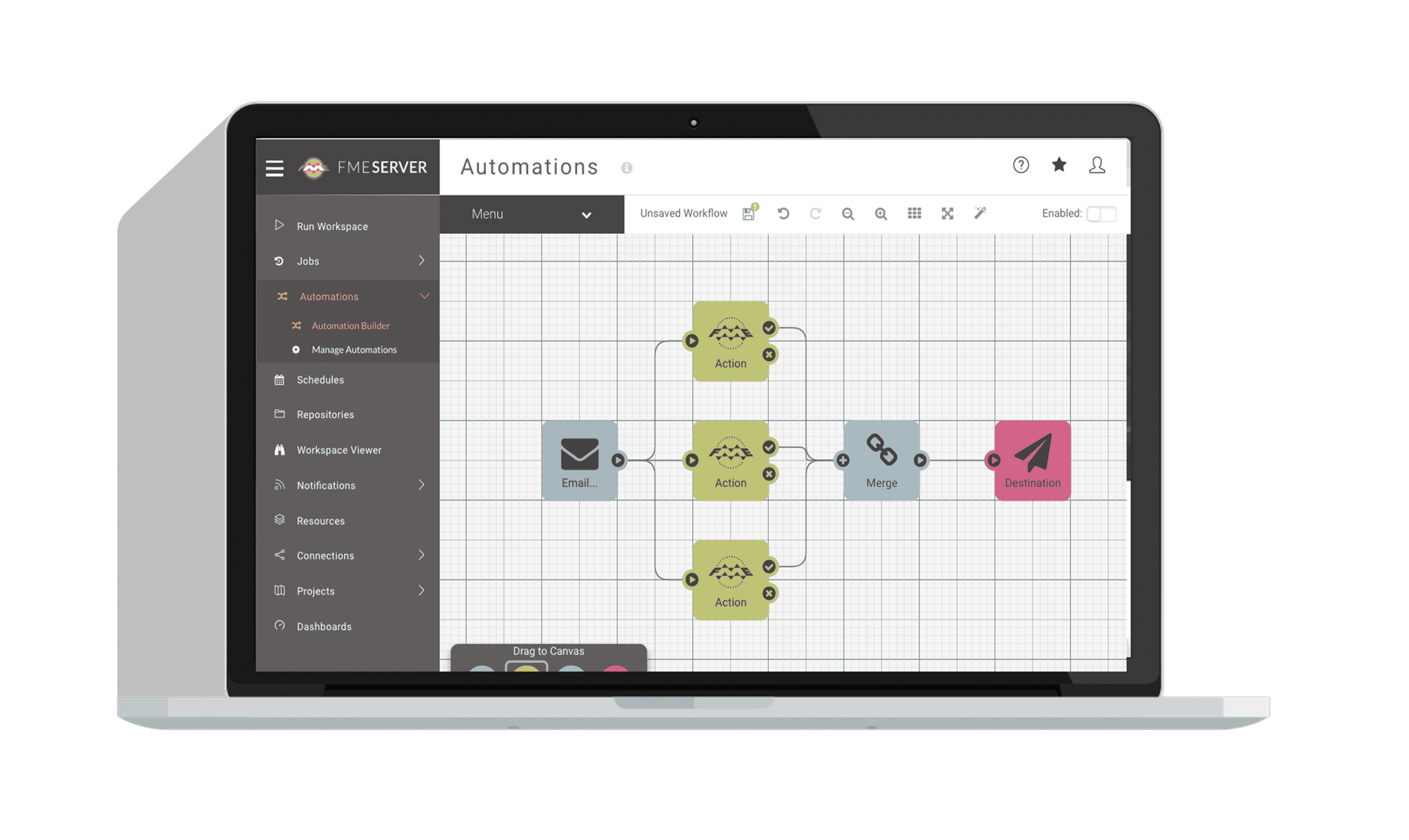 FME Desktop - Build repeatable data conversion and transformation workflows using an intuitive drag-and-drop interface. |