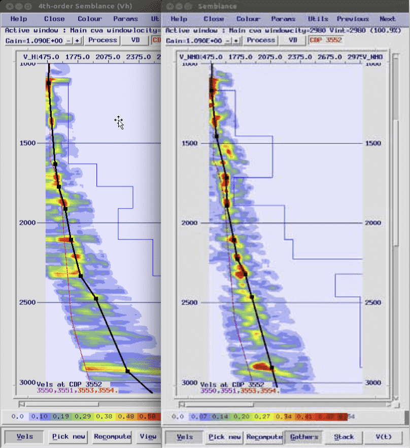 Múltiples ventanas de análisis se pueden abrir en simultáneo, sincronizadas entre ellas, actualizando las ediciones realizadas en tiempo real. El procesamiento de grandes volúmenes de información sísmica 3D puede llegar a ser una labor repetitiva. Sin embargo, es primordial y necesaria para tener un fuerte control de calidad en los resultados. Para ello, CVA realiza una auto-interpolación del área circundante, de modo que la próxima selección estará prácticamente realizada por el programa. De esa manera, el usuario ahorra tiempo que puede implementar refinando las velocidades.