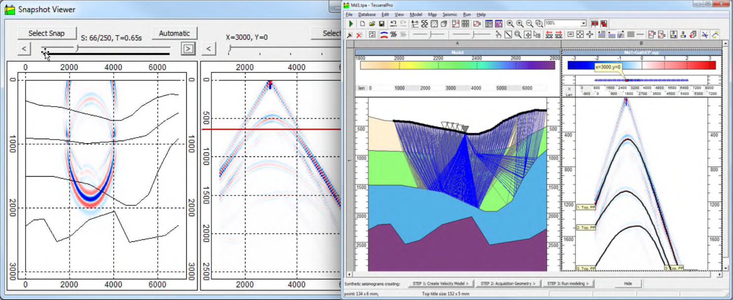 By using Tesseral, users are able to create “synthetic shotgathers”, wave-field movies, incident wave time-fields, time sections, among others seismic images, AVO, etc., to perform analysis of arbitrary complexity models (high lateral velocity contrast, steep boundaries, compartmentalization, etc.), complex topography and near-surface conditions (sources and receiver’s elevation differences, traps, permafrost, low-velocity and variable thickness zones, refractions and surface wave-dynamics), thin layer models built from acoustic logs and density, visco-elastic properties, fluid saturated porous media models, among others. As a result, you can give recommendations on seismic design surveys, endorse seismic data processing workflows (conventional seismic, micro-seismic, VSP or high-frequency well logs simulation), AVO modeling for porous media, anisotropic, fluid saturated changing physical properties laterally and vertically, and verify the seismic interpretation accuracy for reflected discontinuities, and structural elements among others functionalities.